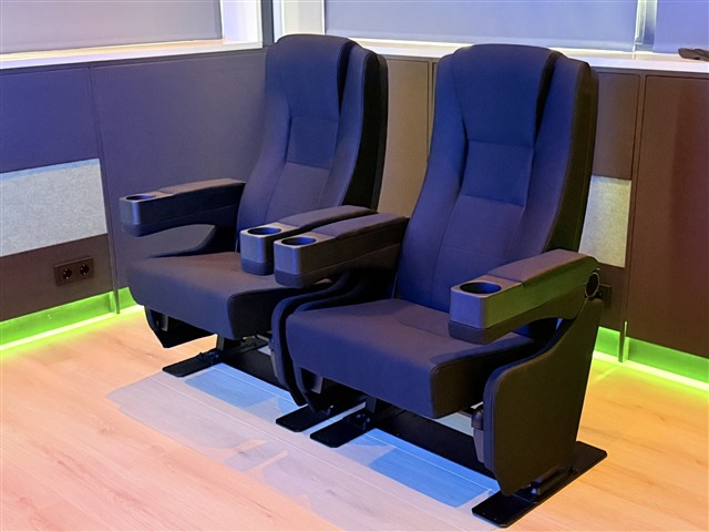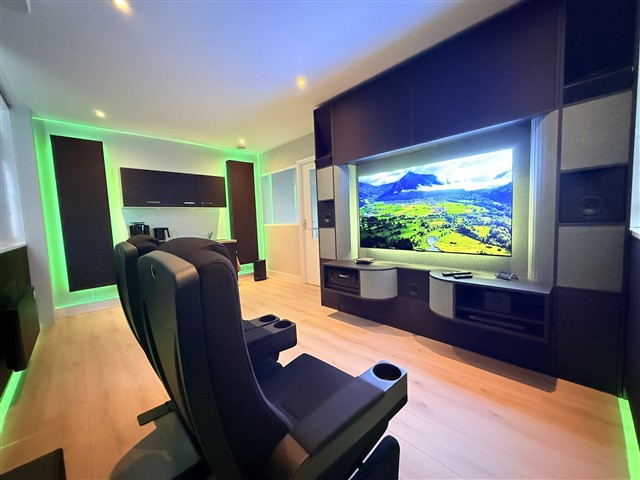 Kom luisteren in onze demo homecinema compleet met bioscoopstoelen en surroundgeluid met 10 geintegreerde speakers en shakers op de stoelen.