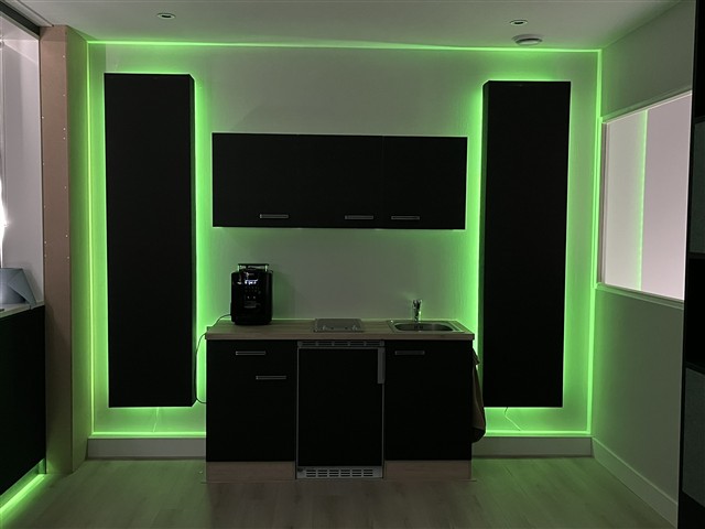 Voor deze demo ruimte werd besloten geen losstaande modules te fabriceren, maar de akoestische elementen te integreren in de cinemawand, rechter zijwand en achterwand. Daarnaast zijn er twee losstaande modules aan de linker wand gemoneerd.